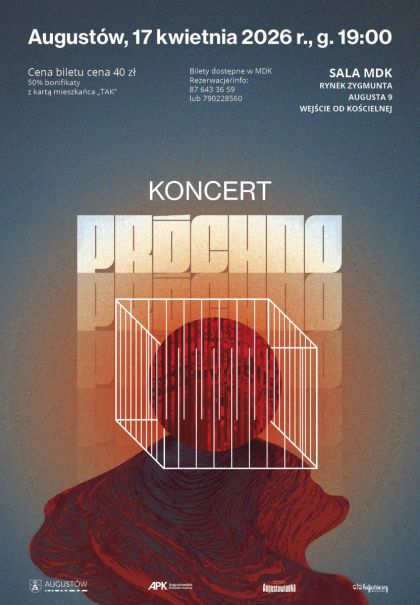 Augustowskie Placówki Kultury serdecznie zapraszają w piątek 17 kwietnia 2026 o godz. 19:00 do sali widowiskowej Miejskiego Domu Kultury na koncert zespołu Próchno.