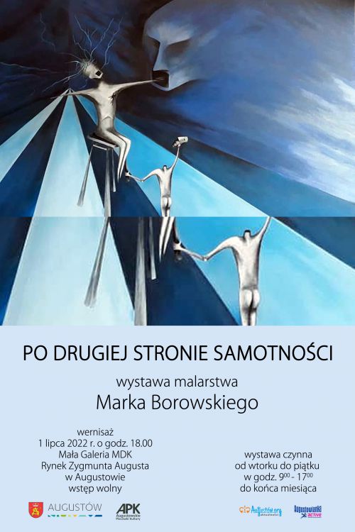 Ekspozycja pt. ”Po drugiej stronie samotności” jest pierwszą indywidualną wystawą Marka Borowskiego, od 14 lat mieszkającego w Augustowie. Na co dzień prowadzi swój męski salon fryzjerski. Hobbystycznie od 4 lat maluje obrazy techniką akrylową. Jest samoukiem i z każdym powstającym obrazem rozwija swoje umiejętności malarskie. Projekty obrazów tworzy z wyobraźni, gdzie tematem jest człowiek, czas i to co nas dotyka na co dzień. Jego obrazy to abstrakcje, w których odbiorca ma możliwość własnej interpretacji. Poza malarstwem interesuje się muzyką, kolekcjonowaniem płyt.