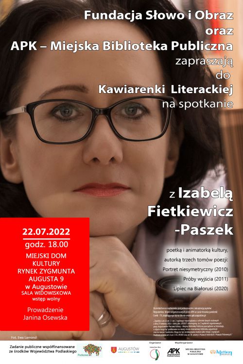 Augustowskie Placówki Kultury oraz Fundacja Słowo i Obraz zapraszają na kolejne spotkanie z cyklu „Kawiarenka Literacka” – spotkanie z Izabelą Fietkiewicz-Paszek, poetką i animatorką kultury.