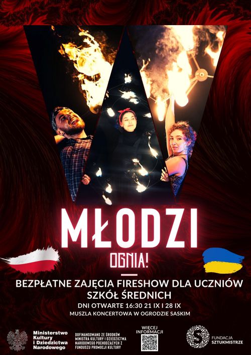 Młodzi Ognia! to cykl bezpłatnych zajęć fireshow dla młodzieży w wieku 15-19 lat. Spotykać będziemy się co tydzień w środy od 16:30 do 18:00, od września do końca grudnia, a sezon zakończymy wspólnym pokazem fireshow przygotowywanym i wykonywanym przez uczestników pod okiem kadry trenerskiej. Zajęcia prowadzone będą przez czołowych artystów i trenerów fireshow w Polsce.