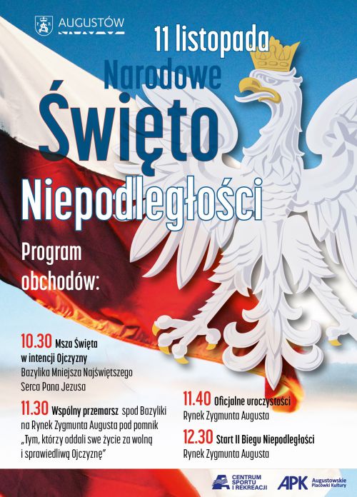 W imieniu Burmistrza Miasta Augustowa serdecznie zapraszamy mieszkańców i gości na uroczystości z okazji 104. rocznicy odzyskania niepodległości przez Polskę.