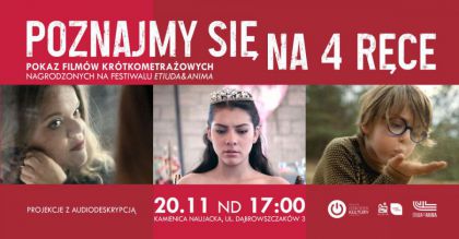 MOK Olsztyn serdecznie zaprasza na projekcję trzech filmów krótkometrażowych, nagrodzonych na festiwalu Etiuda&Anima! Wydarzenie „Poznajmy się na 4 ręce” odbędzie się w niedzielę 20 listopada o godz. 17:00 w Kamienicy Naujacka.