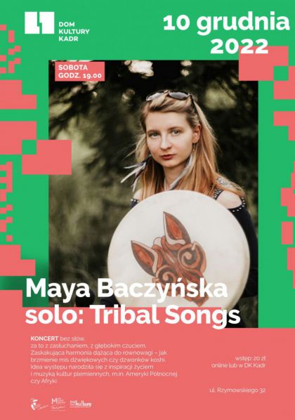 Po autorskim solowym projekcie „Strange Songs” inspirowanym polską muzyką tradycyjną, przyszedł czas na „Tribal Songs” – koncert, którego idea narodziła się z inspiracji życiem i muzyką kultur plemiennych, m.in. Ameryki Północnej czy Afryki. I znów – dziwnych piosenek uczymy się sami. I potrafimy je jedynie sami zaśpiewać. Inaczej przestają być takie dziwne. Mogą być o wszystkim i o niczym, mogą być zasłyszane, mogą być reinterpretowane, mogą być własne. Są intuitywne, improwizowane, trochę obce, a trochę bliskie. I trochę jak organowa polifonia – tutaj wyśpiewana naturalnym głosem. A pomiędzy – ciche, instrumentalne interludia i przestrzeń na zdarzenia, które w innych okolicznościach być może byłyby nie do pomyślenia. Tym razem bez słów, za to z zasłuchaniem, z głębokim czuciem. Zaskakująca, rozwibrowana harmonia dążąca do równowagi – jak brzmienie mis dźwiękowych czy dzwonków koshi. Jak energia, która nie mieści się już dłużej w jednym człowieku, a przecież nie może tak po prostu, nieproszona, wyjść – trzeba ją przywołać, zaprosić, nie spłoszyć, pozwolić się jej wyrażać i być. Ta energia pozwala doświadczać i współodczuwać z tymi, co kroczyli za nami, z tymi, co kroczą z nami dzisiaj i z tymi, co będą kroczyć po nas. Z pewnego punktu widzenia przeszłość, teraźniejszość i przyszłość to jedno, nasi przodkowie i nasi potomkowie być może są z nami.