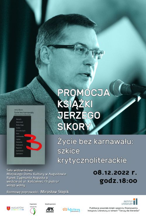 Augustowskie Placówki Kultury oraz Fundacja Słowo i Obraz zapraszają na spotkanie z ks. Jerzym Sikorą w ramach cyklu „Kawiarenka Literacka. 8 grudnia 2022 o godz. 18:00 w sali widowiskowej Miejskiego Domu Kultury w Augustowie (Rynek Zygmunta Augusta 9, wejście od ul. Kościelnej, II piętro) z poetą porozmawia Mirosław Słapik.