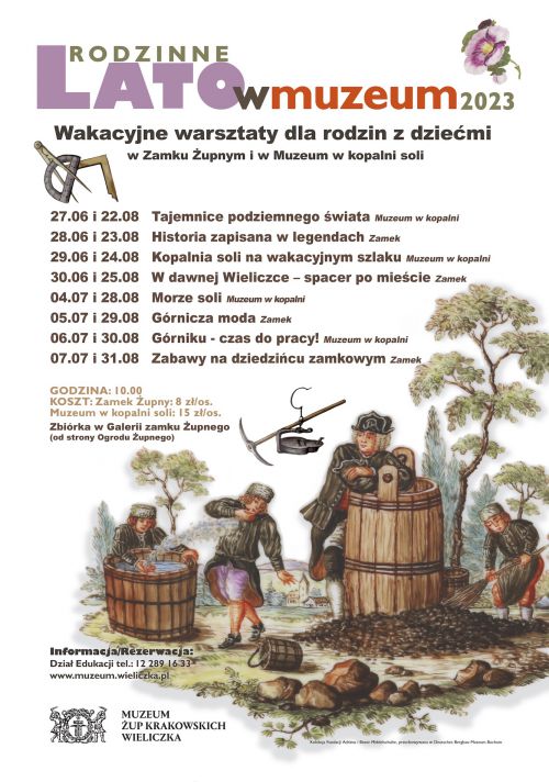 Muzeum Żup Krakowskich Wieliczka zaprasza na letnie spotkania w ramach Rodzinnego Lata w Muzeum. Na uczestników czekają ciekawe tematy i fajna zabawa w dwóch obiektach wpisanych na Listę UNESCO: w Zamku Żupnym i Muzeum w kopalni soli. Zajęcia będą się odbywać o godz. 10.00 w terminach: 27.06 – 07.07 (wtorek - piątek) i 22 – 31.08 (poniedziałek - czwartek). Rezerwacja: Dział Edukacji – tel. 12 289 16 33.