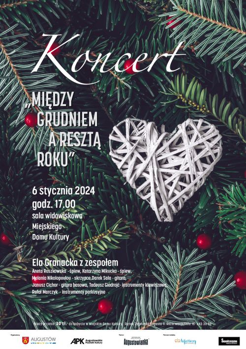 W sobotę 6 stycznia 2024 w sali widowiskowej Miejskiego Domu Kultury (Rynek Zygmunta Augusta 9, wejście od ul. Kościelnej II piętro) o godz. 17:00 rozpocznie się wydarzenie, w którym zaprezentuje się Elżbieta Granacka oraz jej grający i śpiewający przyjaciele: Katarzyna Mikucka i Aneta Roszkowska (śpiew), Janusz Cichor (gitara basowa), Tadeusz Giedrojć (instrumenty klawiszowe), Rafał Marczyk (instrumenty perkusyjne) Melania Nikolopoulu (skrzypce), Dariusz Sala (gitara). Podczas koncertu „Między grudniem a resztą roku” będzie można usłyszeć świąteczne piosenki oraz utwory z nurtu poezji śpiewanej.
