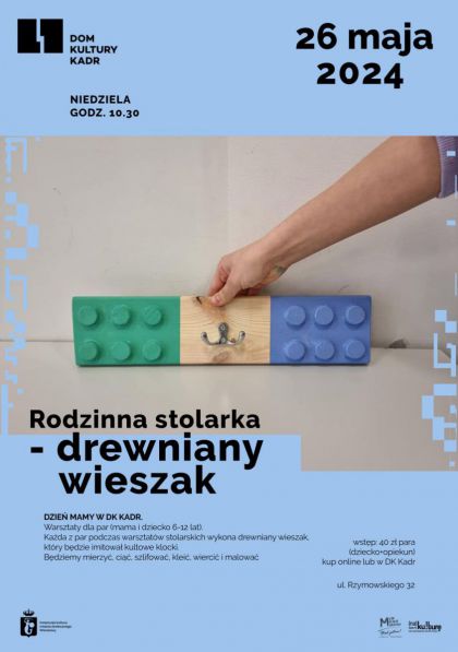 Zajęcia stolarskie dla mam z dziećmi to okazja do wspólnego, aktywnego świętowania Dnia Mamy. Działamy w parach: mama + dziecko (od 6 roku życia). Każda z par wykona drewniany wieszak, który będzie imitował kultowe klocki i pomoże w organizacji garderoby dzieci 😉 Na początku spotkania dzieci zapoznają się z podstawowymi zasadami BHP, aby później mogły przystąpić do mierzenia, cięcia, szlifowania, klejenia, wkręcania i malowania. Będzie się działo! Gorąco zapraszamy!