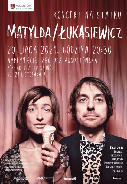 Augustowskie Placówki Kultury serdecznie zapraszają na koncert grany na pokładzie statku! Już w sobotę 20 lipca 2024r. o godz. 20:30 z portu Żeglugi Augustowskiej wystartuje koncertowy rejs*. Tego wieczoru, w malowniczej scenerii jezior i lasów wystąpi przed Państwem duet Matylda/Łukasiewicz. Są jednym z najgorętszych zjawisk na muzycznej scenie. W styczniu minął rok od pierwszej głośnej premiery, czyli utworu “Matka”, który zyskał niemal wiralową popularność i na stałe zagościł na najważniejszych playlistach. Od tamtej pory ukazało się jeszcze sześć utworów: „Zamknąć”, „Mężczyźni”, „Nudny Rok”, „Nie Stało Się Nic”, „Czuły Barbarzyńca” oraz „Sepleń” - wszystkie łączy jeden mianownik: mocny tekst, niebanalne linie melodyczne i charyzmatyczny głos.