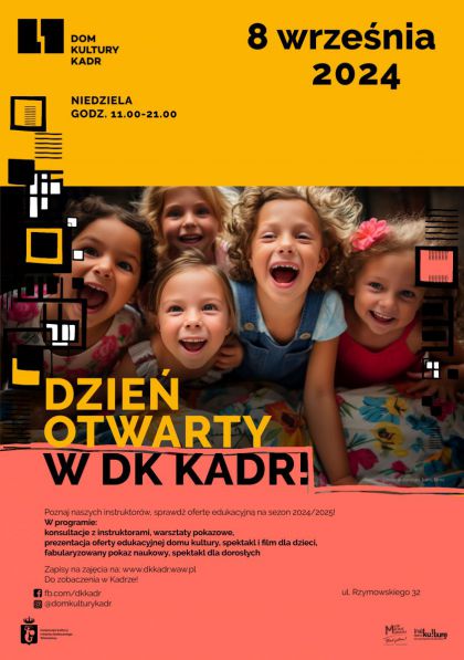 Dzień Otwarty to wyjątkowa okazja, by zanurzyć się w różnorodnych zajęciach pokazowych i odkryć bogatą ofertę edukacyjną Domu Kultury Kadr na sezon 2024/2025. Od tańca i teatru po sztuki wizualne – każdy znajdzie coś dla siebie!