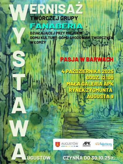 Augustowskie Placówki Kultury zapraszają wyjątkowo w sobotę – 4 października 2025 o godz. 12:00 do Małej Galerii APK przy Rynku Zygmunta Augusta 9 na wernisaż „Pasja w barwach” Twórczej Grupy FANABERIA działającej przy Miejskim Ośrodku Kultury – Domu Środowisk Twórczych w Łomży.