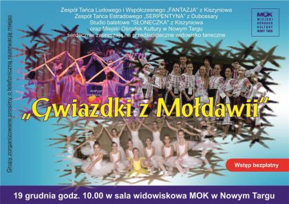 Zespół Tańca Ludowego i Współczesnego „FANTAZJA” z Kiszyniowa ,Zespół Tańca Estradowego „SERPENTYNA” z Dubossary , Studio baletowe "SŁONECZKA" z Kiszyniowa oraz Miejski Ośrodek Kultury w Nowym Targu serdecznie zapraszają na przedświąteczne widowisko taneczne "Gwiazdki z Mołdawii" W dniu 19 grudnia o godz. 10.00 w Sali widowiskowej MOK w Nowym Targu . Grupy zorganizowane prosimy o telefoniczną rezerwację miejsc. Wstęp bezpłatny