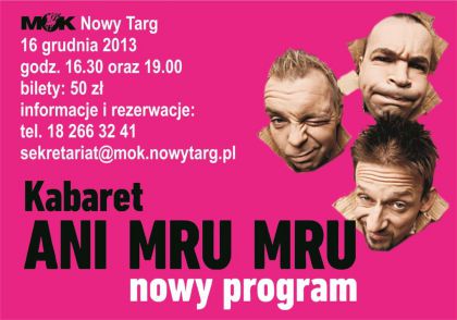 Zapraszamy na nowy program Kabaretu Ani Mru Mru, który odbędzie się w poniedziałek 16 grudnia o godz. 19.00, informujemy, że dodatkowy występ rozpocznie się o godz. 16.30 w sali widowiskowej Miejskiego Ośrodka Kultury w Nowym Targu. Bilety 50 zł - rezerwacje: 18 266 32 41, sekretariat@mok.nowytarg.pl