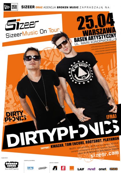 Wiosną Sizeer Music On Tour wraca do klubów prezentując aktualne brzmienia w wykonaniu artystów ze światowej czołówki muzyki elektronicznej. 25 kwietnia w warszawskim Basenie Artystycznym, mocno zbasowany, imprezowy ferment wprowadzą znawcy skreczu i tworzenia tanecznych rytmów na żywo – ekipa Dirtyphonics prosto z Francji.