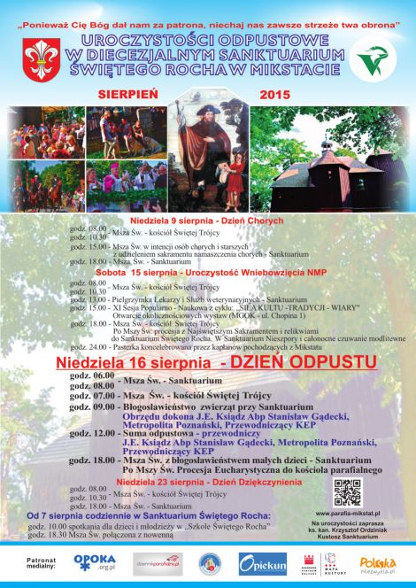 16 sierpnia w Diecezjalnym Sanktuarium w Mikstacie (pow. Ostrzeszów) odbędą się uroczystości odpustowe ku czci Świętego Rocha, patrona chorych,pielgrzymów, aptekarzy,więźniów, weterynarzy,ale także opiekuna zwierząt. To tu od ponad trzystu lat z okazji uroczystości odpustowych odbywa się obrzęd błogosławieństwa zwierząt. W dniu liturgicznego wspomnienia Świętego Rocha przed bramą prowadzącą do Sanktuarium przechodzi niezwykła procesja, składająca się z kucyków, chomików, królików, psów i kotów różnej wielkości i ras, koni, krów, papug, gołębi, kóz, kurczaków i innych ptaków i zwierzaków. Jednym słowem prawie całą Arka Noego. Tę niezwykłą procesje trzeba w Mikstacie koniecznie przeżyć, zobaczyć,ale można się w nią także włączyć przywożąc bądź przyprowadzając swoje zwierzątka.Przygotowania do tych uroczystości rozpoczynają się już znacznie wcześniej. Od 7 sierpnia o godz. 18:30 odprawiana jest w Sanktuarium Msza Święta, a po niej nowenna do Świętego Rocha. W tym samym dniu rusza IV edycja spotkań dla dzieci i młodzieży w ramach Szkoły Świętego Rocha. W niedzielę poprzedzającą odpust odbywa się w Sanktuarium spotkanie modlitewne osób chorych i starszych. A potem już wielkie świętowanie, dzień odpustu, na który przybywają do Mikstatu pielgrzymi i turyści z najodleglejszych zakątków naszego kraju. Zapraszamy do Mikstatu na niezwykłe uroczystości odpustowe.