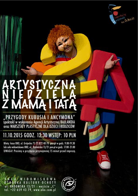 Zapraszamy na niedzielne spotkanie artystyczne dla dzieci i rodziców. Program imprezy podzielony jest na warsztaty plastyczne oraz prezentację teatralną i muzyczną.Tym razem spotkamy się z „Przygodami Kubusia i Ancymona”.To wesoła, dynamiczna i pełna zawadiackich zwrotów akcji bajka, przenosząca dzieci w świat fantazji za sprawą baśniowej muzyki i barwnej scenografii. Dzięki głównym bohaterom dzieci przez cały spektakl w bajkowy sposób poznają skomplikowany świat matematyki, dowiadują się, jak cenna jest nauka i dlaczego warto chodzić do szkoły. Bohaterami są dwaj chłopcy. Kubuś to rezolutny, dzielny, prawdziwy przyjaciel zwalczający wszelkie zło, prymus i miłośnik rozwiązywania pracdomowych. Drugi z nich, Ancymon, to całkowite przeciwieństwo Kubusia – urwis jakich mało, matematyczny żółtodziób i nygus. Mimo tak wielu różnic, łączy ich prawdziwa przyjaźń, która zostanie wystawiona na próbę, gdy na ich drodze pojawi się Czarownica, płatając chłopcom różne figle. Czy Ancymon zostanie zamieniony w żabę? Czy Kubusiowi uda się przechytrzyć Czarownicę? Czy dobro zwycięży? Odpowiedzi znajdziecie oglądając ten magiczny spektakl!