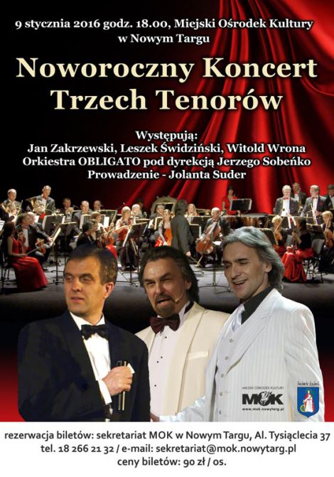 z przyjemnością pragniemy Państwa zaprosić na Koncert Noworoczny, który odbędzie się 09 stycznia 2016 r. w Miejskim Ośrodku Kultury o godz.18.00. Tym razem zaśpiewa dla Państwa trzech znakomitych tenorów: