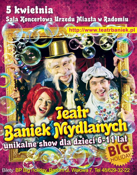 Niesamowite mydlane bańki robią niezapomniane wrazenie na wszystkich, a bajeczny karnawal olbrzymich mydlanych baniek na scenie, podaruję odczucie zachwytu dzieciom i dorosłym. Spiektakl zawiera edukacyjną część (historia powstania mydła oraz znaczenie higieny) Zanurzcie się do świata dzieciństwa i radości całą rodziną!