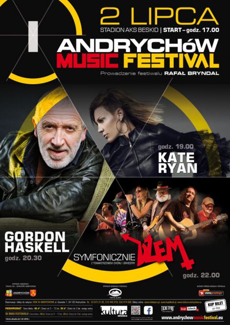 Kate Ryan – flamandzka wokalistka muzyki eurodance i pop, znana m.in. z takich hitów jak: „Désenchantée”, „Voyage Voyage”, „Ella Elle L'a” czy „Libertine”. Gordon Haskell to brytyjski wokalista, basista i autor piosenek – mega hitem stała się jego piękna ballada „How Wonderful You Are”. Haskell słynie z bardzo żywiołowych koncertów, każdy jego występ ze świetnym zespołem kończy się owacjami na stojąco i bisami. Główną gwiazdą andrychowskiego koncertu będzie Zespół DŻEM – legenda polskiej sceny rockowo-bluesowej – w wyjątkowym koncercie symfonicznym z towarzyszeniem orkiestry oraz chóru! Szczegóły wkrótce!!!