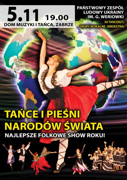 „Tańce i pieśni narodów świata" to unikalne show taneczno-wokalne, które prezentuje najciekawsze tańce ludowe i kompozycje muzyczne kilkunastu narodów. Na scenie pojawią się aż 82 osoby! Program stanowi wyjątkową wędrówkę przez kraje i kontynenty, podczas której widzowie poznają tajemniczy świat tańca orientalnego, ukraińskie akrobacje, urok tańców europejskich, a wszystkiemu towarzyszyć będzie mistrzowska orkiestra, zachwycająca specjalnie przygotowanymi na tę okazję występami solowymi. Warto także zwrócić uwagę na grupę wokalną, która oczaruje urokliwymi śpiewami gruzińskimi a capella