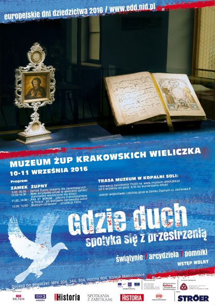 Muzeum Żup Krakowskich Wieliczka zaprasza do udziału w Europejskich Dniach Dziedzictwa 2016 r., w dniach 10-11 września w godzinach 9.00-20.00. Tegoroczne wydarzenie odbywa się pod hasłem „Gdzie duch spotyka się z przestrzenią - świątynie, arcydzieła, pomniki”.