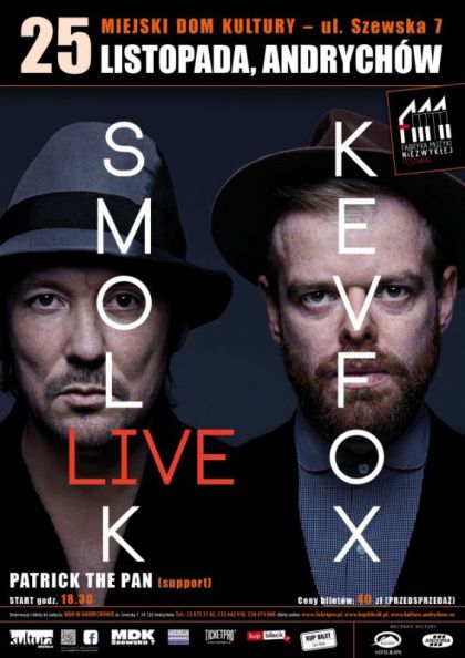 Dwie indywidualności, które łączy niesamowita pasja do pokonywania granic i odkrywania nowych przestrzeni artystycznych. Decyzja o nagraniu wspólnego albumu była naturalnym rozwinięciem współpracy Andrzeja Smolika – znakomitego polskiego producenta i Keva Foxa – brytyjskiego songwrittera. Obecnie SMOLIK // KEV FOX to jeden z najlepiej ocenianych albumów 2015 roku za który artyści odebrali FRYDERYKA w kategorii elektronika i alternatywa. Ich pierwszy singiel Run przez wielu uznawany jest jako utwór roku. Kolejny singiel to Regretfully Yours z gościnnym udziałem Y (Bokka). Misternie skonstruowane, pełne melancholii melodie, niepowtarzalny, hipnotyzujący, silny wokal KEVA przeciwstawiony minimalistycznemu brzmieniu gitary, i tak charakterystycznemu brzmieniu instrumentów wszelkich, za które odpowiada SMOLIK, z pewnością zabierze słuchaczy w niezwykłą podróż.