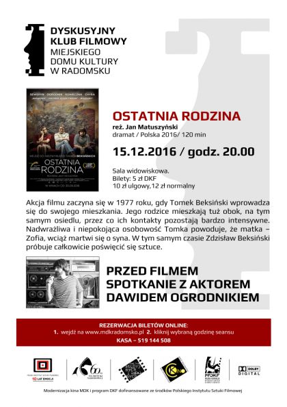 Gościem grudniowego DKFu będzie znakomity aktor Dawid Ogrodnik, odtwórca jednej z głównych ról "Ostatniej rodziny" - filmu, który jesienią podbił serca Polaków opowieścią o rodzinie Beksińskich. Po spotkaniu zapraszamy na projekcję w/w filmu.