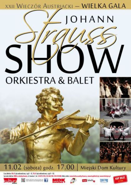 WIELKA GALA JOHANN STRAUSS SHOW – po spektakularnych sukcesach na rynku brytyjskim, irlandzkim, niemieckim, szwajcarskim i amerykańskim zaprezentowany zostanie w Polsce, w Miejskim Domu Kultury w Andrychowie. Zapraszamy.