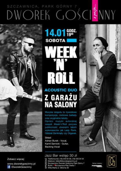 Muzyka zespołu to żywiołowe kompozycje, rockowe ballady oraz oryginalne teksty. Oprócz muzyki autorskiej zespół Week'n'Roll porywa publiczność utworami takich wykonawców jak Lady Pank, Oddział Zamknięty czy Organek.
