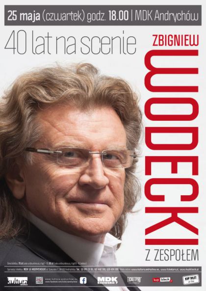 Centrum Kultury i Wypoczynku w Andrychowie zaprasza na koncert Zbigniewa Wodeckiego z zespołem, który odbędzie się 25 maja w Miejskim Domu Kultury. Zbigniew Wodecki, legenda polskiej estrady, nierozerwalnie związany z nią już od 40 lat. Wszechstronnie uzdolniony instrumentalista, kompozytor, aranżer. Nieustannie bawi i wzrusza publiczność wielu pokoleń i o różnych gustach muzycznych. Wszyscy doskonale znamy piosenki takie jak „Zacznij od Bacha”, „Opowiadaj mi tak”, „Lubię wracać tam, gdzie byłem”, „Chałupy Welcome To”, „Izolda” czy „Pszczółka Maja”. Podczas koncertu z okazji 40-lecia pracy artystycznej usłyszymy więc największe przeboje Zbigniewa Wodeckiego.