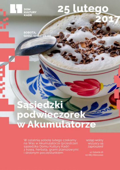 W ostatnią sobotę lutego czekamy na Was w Akumulatorze (przestrzeń sąsiedzka Domu Kultury Kadr) z kawą, herbatą, grami planszowymi i drobnym poczęstunkiem.