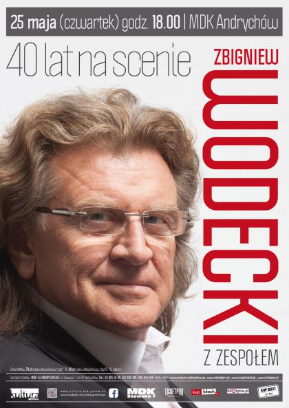 Centrum Kultury i Wypoczynku w Andrychowie zaprasza na koncert Zbigniewa Wodeckiego z zespołem, który odbędzie się 25 maja w Miejskim Domu Kultury. Zbigniew Wodecki, legenda polskiej estrady, nierozerwalnie związany z nią już od 40 lat. Wszechstronnie uzdolniony instrumentalista, kompozytor, aranżer. Nieustannie bawi i wzrusza publiczność wielu pokoleń i o różnych gustach muzycznych. Wszyscy doskonale znamy piosenki takie jak „Zacznij od Bacha”, „Opowiadaj mi tak”, „Lubię wracać tam, gdzie byłem”, „Chałupy Welcome To”, „Izolda” czy „Pszczółka Maja”. Podczas koncertu z okazji 40-lecia pracy artystycznej usłyszymy więc największe przeboje Zbigniewa Wodeckiego.