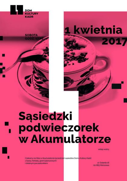 Czekamy na Was w Akumulatorze (przestrzeń sąsiedzka Domu Kultury Kadr) z kawą, herbatą, grami planszowymi i drobnym poczęstunkiem.