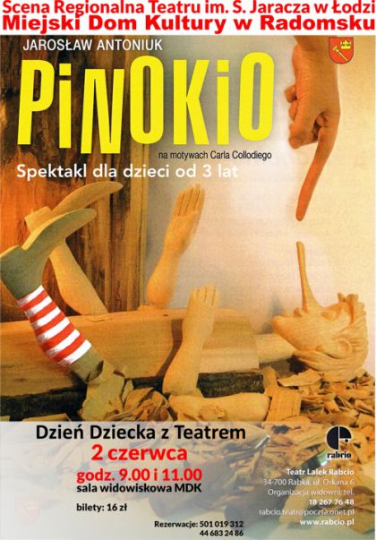 2 czerwca 2017 r. o godz.9.00 i 11.00 Scena Regionalna im.S.Jaracza w Miejskim Domu Kultury w Radomsku zaprasza Najmłodszych na przedstawienie pt. "Pinokio" Teatr Lalek "RABCIO" z Rabki - Zdrój.