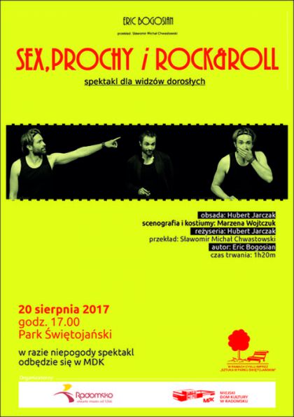 Teatralny akcent w Parku Świętojańskim czyli monokomedia "Sex, prochy i rock'n'roll" 20 sierpnia 2017 r. w wykonaniu znakomitego aktora Teatru im. S. Jaracza w Łodzi - Huberta Jarczaka. Przedstawienie rozpocznie się o godz.17.00. Spektakl dla widzów dorosłych.