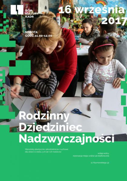 W ramach Rodzinnego Dziedzińca Nadzwyczajności odbędą się warsztaty plastyczne, rękodzielnicze i ruchowe dla dzieci w wieku 3–6 lat i ich rodziców. Z Julią Pańków będzie można stworzyć mozaiki-mandale ze skarbów jesieni. Daniel Chmielewski poprowadzi warsztat „Tekturowe miasto”. Z Natalią Krzemieńską zaś udamy się w taneczną podróż inspirowaną malarstwem.