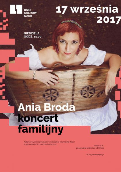 Autorski występ specjalistki w dziedzinie muzyki dla dzieci, inspirowanej m.in. muzyką tradycyjną. Ania Broda od wielu lat śpiewa, gra na cymbałach, pianinie, lirze korbowej.
