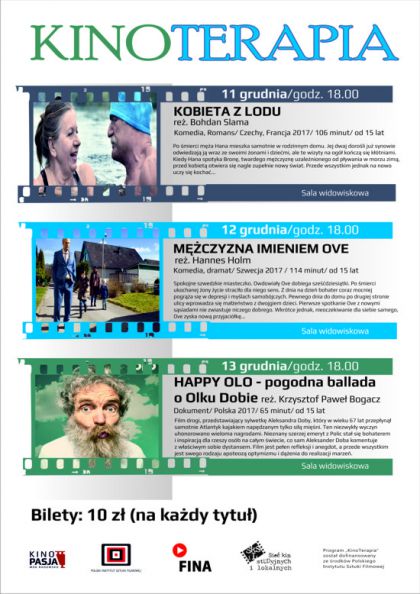 "Kobieta z lodu", "Mężczyzna imieniem Ove", "Happy Olo" to filmy, które będzie można obejrzeć podczas tegorocznej "KinoTerapii". "KinoTerapia"to przegląd filmów, którego celem jest m.in. zintegrowanie różnych środowisk społecznych, aktywne spędzenie wolnego czasu, KinoTerapia to płaszczyzna do dyskusji, wspólnej wymiany myśli, poglądów oraz odkrywania optymistycznych i wartościowych aspektów życia. Filmom towarzyszyć będą spotkania i dyskusje na temat rozwoju osobistego.