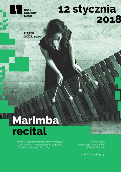 MARIMBA RECITAL to podróż po różnorodnej stylistyce w wirtuozowskim wykonaniu polskiej, wielokrotnie nagradzanej na konkursach marimbafonistki – Eweliny Hajda. Solistce zależy na ukazaniu wszechstronności instrumentu, dlatego koncert wypełnią aranżacje dzieł znanych kompozytorów jak i najpiękniejsze kompozycje dedykowane marimbie. W programie m.in.: A. Piazzolla, P. Mascagni, E. Satie, A. Ignatowicz-Glińska, E. Sejourne.
