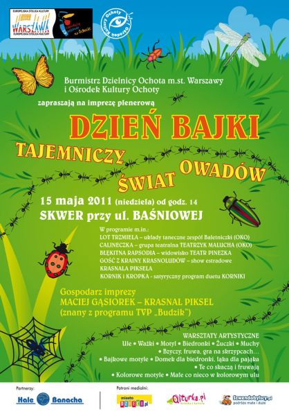 W niedzielę 15 maja Ośrodek Kultury Ochoty wraz z Wydziałem Kultury Urzędu Dzielnicy Ochota m.st. Warszawy organizują bajkową imprezę plenerową, z okazji Dnia Bajki pod tytułem: “Tajemniczy świat owadów”. Na skwerze przy ul. Baśniowej w kilkunastu miejscach zostaną zaaranżowane miejsca, gdzie będą prowadzone różnego rodzaju działania, zarówno dla dzieci, jak i dorosłych, m.in. warsztaty twórcze, happeningi plastyczne, czytanie bajek, działania teatralne, animacje itp.