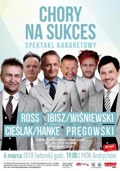Tego jeszcze nie było! Teatr, kabaret i koncert w jednym! Spektakl kabaretowy „Chory na Sukces” jest zabawną próbą ukazania postaci celebryty, którego podczas występu w Andrychowie zagra Michał Wiśniewski. Artysta, chcąc wyjść naprzeciw plotkom i próbom ośmieszenia jego osoby, tworzy na scenie postać zarozumiałego i przekonanego o swej wielkości bufona, po to by dać dowód na posiadany do siebie dystans i zdyskontować to, co się o Nim niesłusznie mówi.