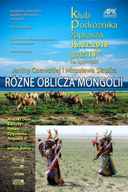 Augustowskie Placówki Kultury zapraszają na niezwykłą prezentację o środkowowschodniej Azji. O różnych obliczach Mongolii w ramach kolejnego spotkania z cyklu Klub Podróżnika 16 lutego o godz. 18:00 w Miejskim Domu Kultury opowiedzą, dzieląc się wspomnieniami, wrażeniami oraz zdjęciami, poeci Janina Osewska z Augustowa i Mirosław Słapik z Gołdapi.