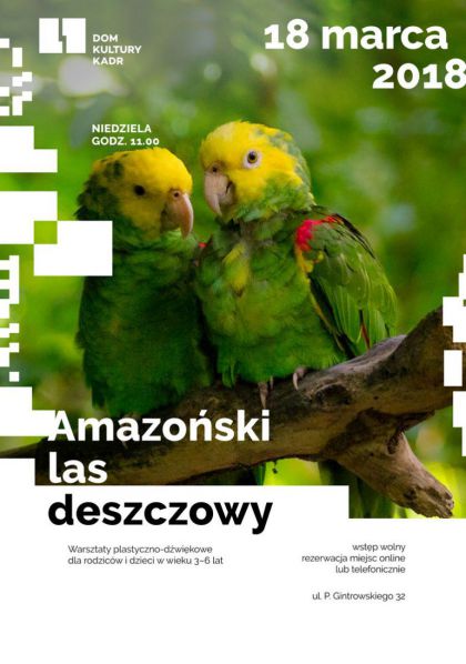 Warsztaty plastyczno-dźwiękowe dla dzieci w wieku 3-6 lat i rodziców/opiekunów realizowane w ramach Rodzinnego Dziedzińca Nadzwyczajności. Zajęcia te będą godzinną podróżą do lasów Amazonii. W ich trakcie zgłębimy wiedzę o florze i faunie tego najbogatszego ekosystemu na świecie. Następnie zdobytą wiedzę przekujemy na działania twórczo-plastyczne. Co więcej, będziemy też naśladować odgłosy, jakie stworzone przez nas istoty wydają.