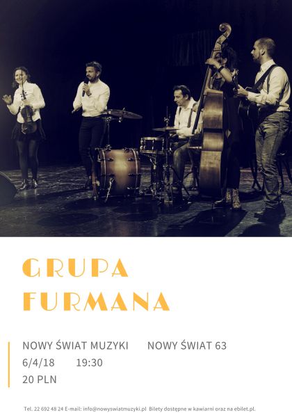 Grupa Furmana istnieje od 20 lat , w tym roku obchodzi 20 lecie zespołu. Zespół składa się z 6 muzyków, w składzie Rafał Gonzo Gondek banjo, dobro, Dośka Dominika Jurczuk-Gondek skrzypce, wokal, Sebastian Chmiel wokal, Marzena Cybulka bas, Walter Edgy klawisze, Tomasz Kinecki perkusja. Zespół zagrał setki koncertów w kraju i za granicą. Doczekał się 5 płyt i paru hitów tj. "Etz" , "Opony" , "Modlitwa" . Grupa Furmana ma własne niepowtarzalne brzmienie, na koncertach łączy swoje utwory z coverami tworząc niepowtarzalne widowisko.