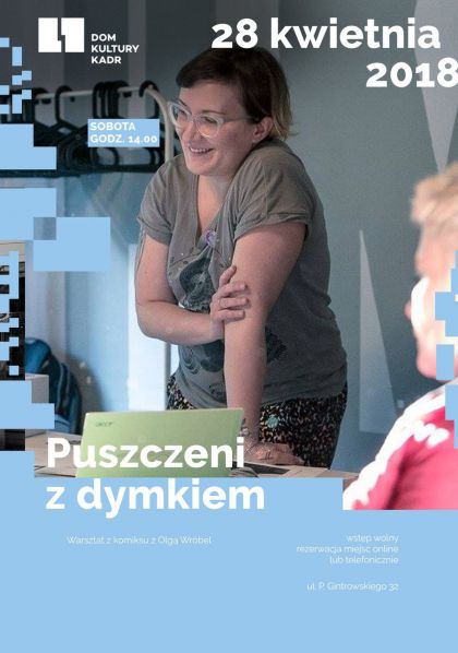 “Puszczeni z dymkiem” to warsztat prowadzony przez znaną komiksiarkę Olgę Wróbel. Dedykowany jest dorosłym i młodzieży (16 +). Umiejętność rysowania nie jest konieczna, gdyż prowadząca skupia się na narracji, budowie planszy i przekazu, niekoniecznie na doskonaleniu kreski. Na początku opowie o tym, czym jest komiks, co go tworzy, jakie są charakterystyczne cechy jego języka. Z pozyskanych w ten sposób cegiełek uczestnicy spróbują stworzyć własną narrację. Każdy dostanie do wyboru dwie mini-prozy poetyckie. Poddane one zostaną wspólnej lekturze i analizie, następnie z Olgą Wróbel spróbują przełożyć twarde słowa na płynny język komiksu dbając o to, żeby to, co najważniejsze nie zaginęło między kadrami.