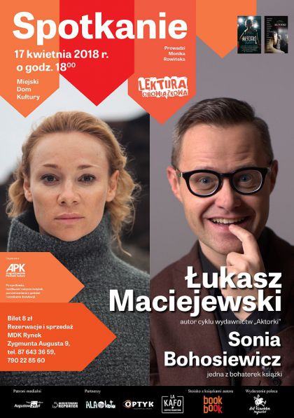 Łukasz Maciejewski, filmoznawca, dziennikarz, krytyk filmowy i teatralny, autor m.in. serii książek o polskich aktorkach - "Aktorki. Odkrycia", "Aktorki. Portrety", „Aktorki. Spotkania”, przyjedzie do Augustowa z Sonią Bohosiewicz – aktorką, piosenkarką i artystką kabaretową, która znana jest widzom i z ekranu kinowego i tego telewizyjnego.