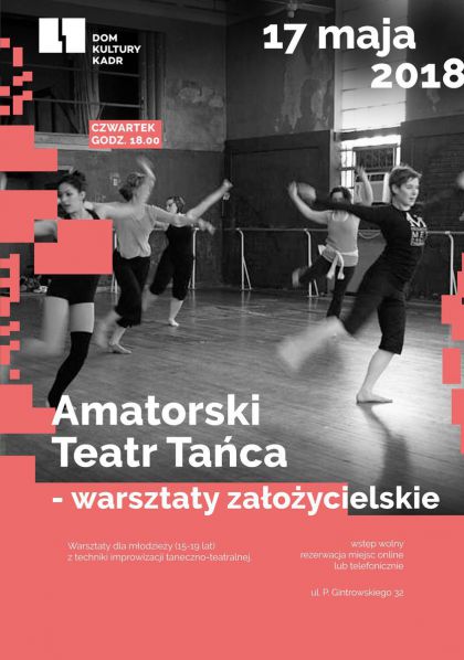 Zapraszamy na warsztat z techniki improwizacji taneczno-teatralnej. Będzie to zapoznanie się z działaniami, które podejmie Amatorski Teatr Tańca na swoich cotygodniowych spotkaniach. W ramach jego funkcjonowania wspólnie stworzymy spektakle taneczne, za pomocą których będziemy przekazywać ważne dla uczestników treści. Amatorski Teatr Tańca jest skierowany do młodzieży w wieku 15-19 lat. Zapraszamy osoby, które lubią tańczyć i żyją muzyką.