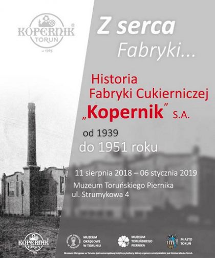 Ukazane zostaną jej losy ze szczególnym uwzględnieniem okresu od 1939 do 1951 roku, przez pryzmat zawirowań wojennych, zmiany właścicieli oraz nazwy samej fabryki. „Z serca Fabryki” – będzie wystawą o dziejach fabryki, pokazanych przez pryzmat miejsca, rozwoju i rozbudowy, asortymentu produkowanego w Fabryce, a także zniszczeń i strat spowodowanych II wojną światową. Krańcowa data - 1951 rok to moment przełomowy, kiedy Toruńska Fabryka Pierników i Cukrów otrzymuje nazwę: „Fabryka Pierników i Wyrobów Cukierniczych „Kopernik” w Toruniu i rozpoczyna się jej najnowsza historia, trwająca do dziś.