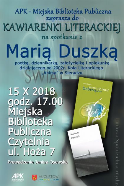 Miejska Biblioteka Publiczna w Augustowie serdecznie zaprasza miłośników poezji na Kawiarenkę Literacką z Marią Duszką. Spotkanie z poetką, dziennikarką, bibliotekarką, animatorką kultury, założycielką i opiekunką działającego od 2002 r. Koła Literackiego „Anima” odbędzie się w poniedziałek 15 października o godz. 17:00 w Czytelni Miejskiej Biblioteki Publicznej w Augustowie, przy ul Hożej 7.