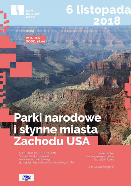 Relacja z kilku wypraw namiotowych do USA. Podczas pokazu zobaczymy Stany Zjednoczone nie tylko od strony nowoczesnych wielomilionowych skupisk ludzkich, ale przede wszystkim od strony absolutnie zjawiskowej przyrody. Parki narodowe USA to m. in. kolorowe pustynie, nieprawdopodobne formacje skalne i góry.