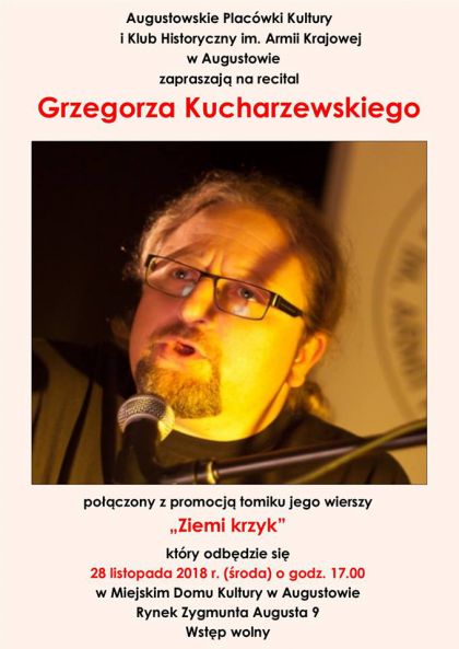 Augustowskie Placówki Kultury i Klub Historyczny im. Armii Krajowej w Augustowie zapraszają na recital Grzegorza Kucharzewskiego połączony z promocją tomiku „Ziemi krzyk”.